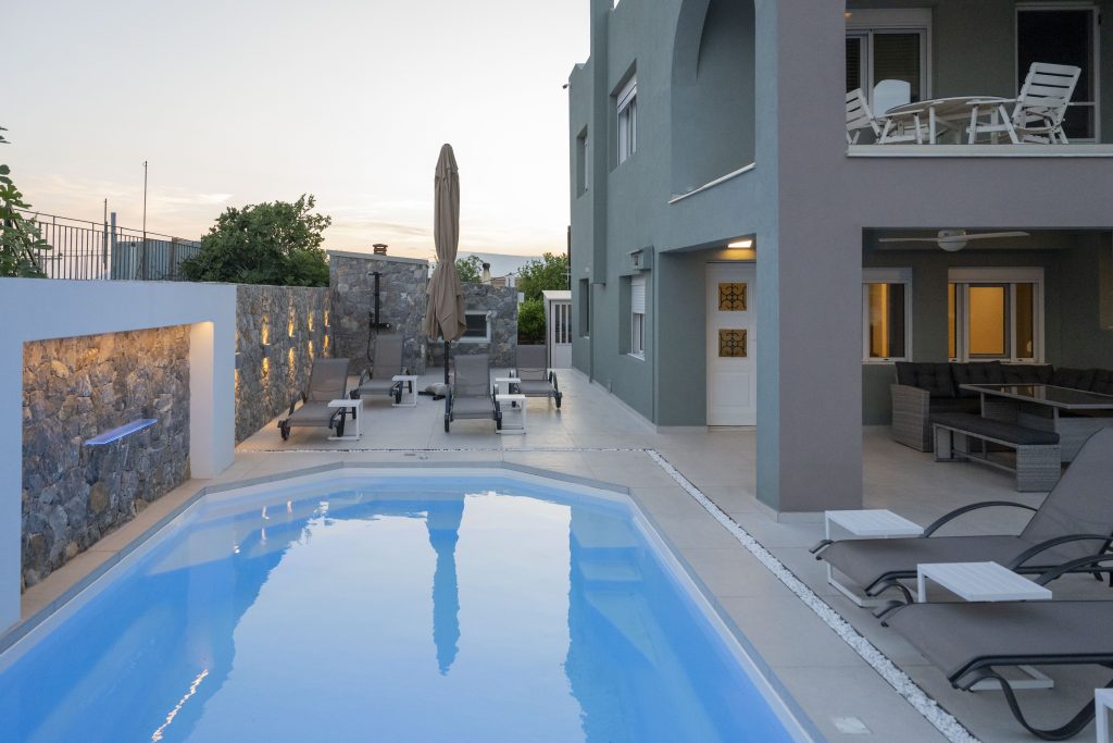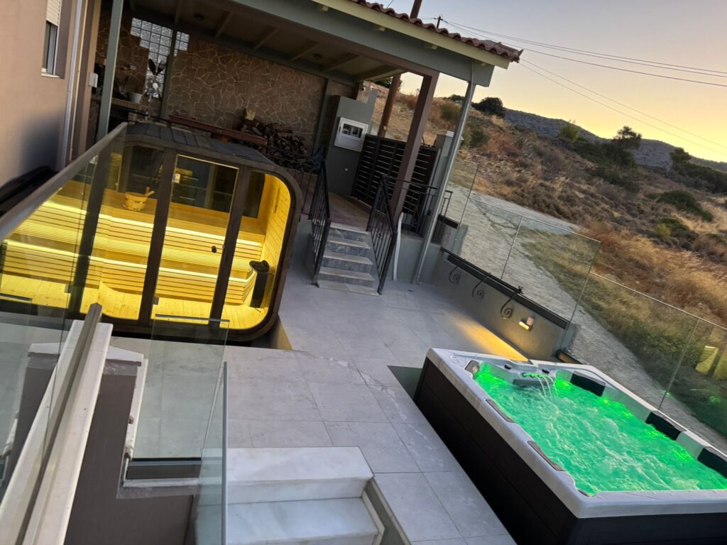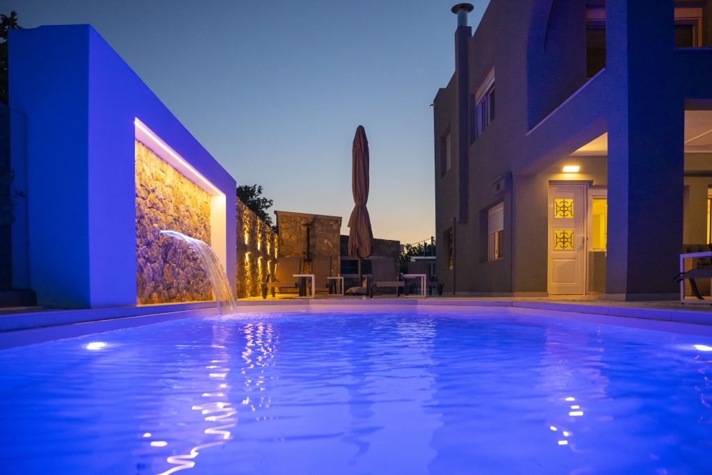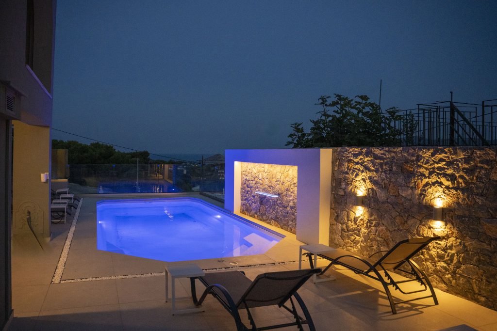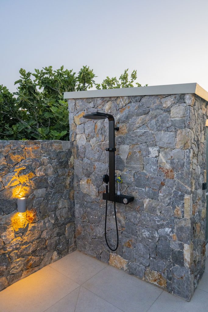 The property features a beautifully designed pool, creating a magical evening ambiance. Enjoy lazy days by the pool on comfortable sun loungers, cool off in the stone-built outdoor shower, or fire up the BBQ for al fresco dining with a view.